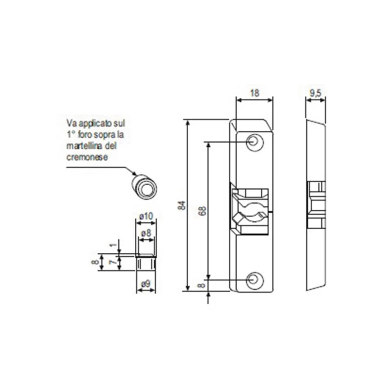 L’incontro scrocco porta Aria 11/12 è un componente progettato per consentire la chiusura temporanea dell’anta, assicurando il corretto aggancio dello scrocco nei sistemi di serramenti compatibili con Aria 11 e Aria 12.