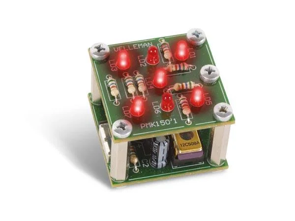 Questo dado elettronico a LED non deve essere lanciato, ma mostra un valore casuale quando viene agitato. Il dado viene fornito in kit con circuito stampato separato e parti per esercitarsi nella saldatura.