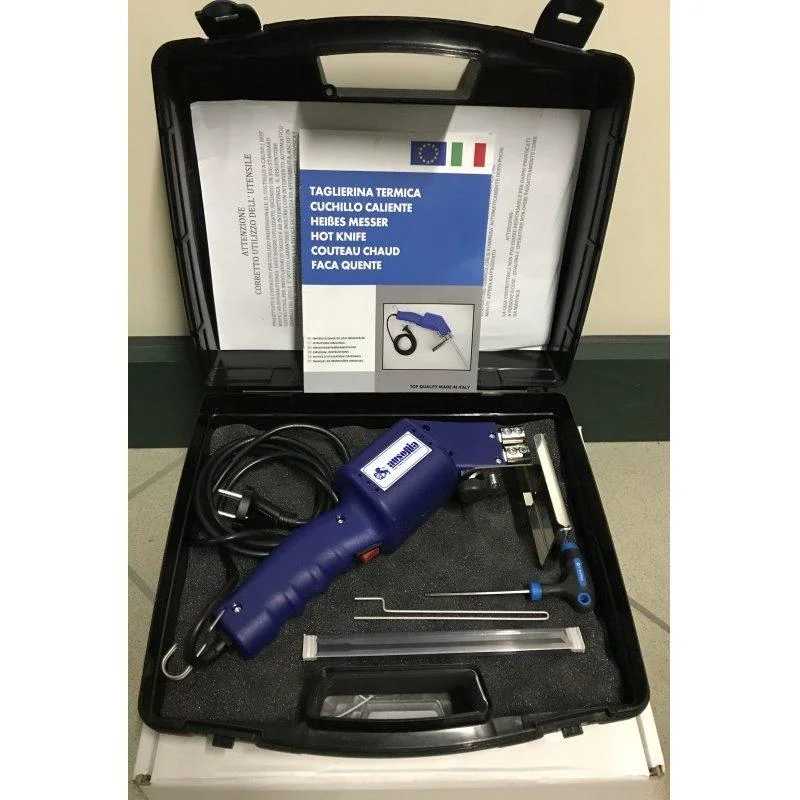 Valigetta completa di un coltello a caldo, una lama da 150 mm, una punta da 120 mm, un supporto inox direzionale, una slitta in inox per incassi, 3 profili sagomati per lisene, un filo da 300 mm modulabile, una slitta per fori ciechi, 3 profili per fori da 60 – 70 – 90 mm.