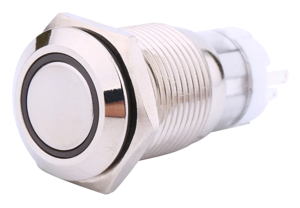 Manopola in metallo con un diametro di montaggio di 16 mm. Questo pulsante ha un anello illuminato a LED rosso, che funziona a 12V tramite un circuito separato. Oltre alle 2 connessioni LED, questo pulsante ha 3 punti di contatto, NO, Comune e NC. Quando il pulsante viene premuto, rimarr\\u00E0 premuto fino a quando non viene premuto nuovamente (blocco). Questo pulsante \\u00E8 adatto per una corrente massima di 3A con una tensione di 250VAC.
