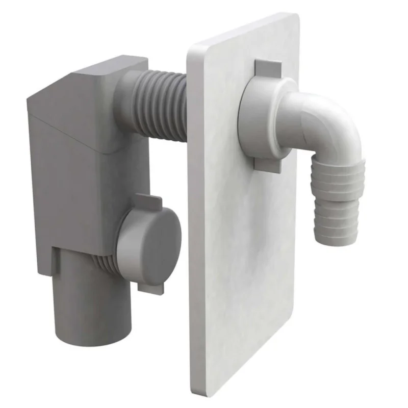 Sifone ad incasso per lavatrice e lavastoviglie in PVC ad incollaggio diretto con le tubazioni.Colore grigio.Dado e portagomma bianchi, con piastra in plastica ABS bianca.