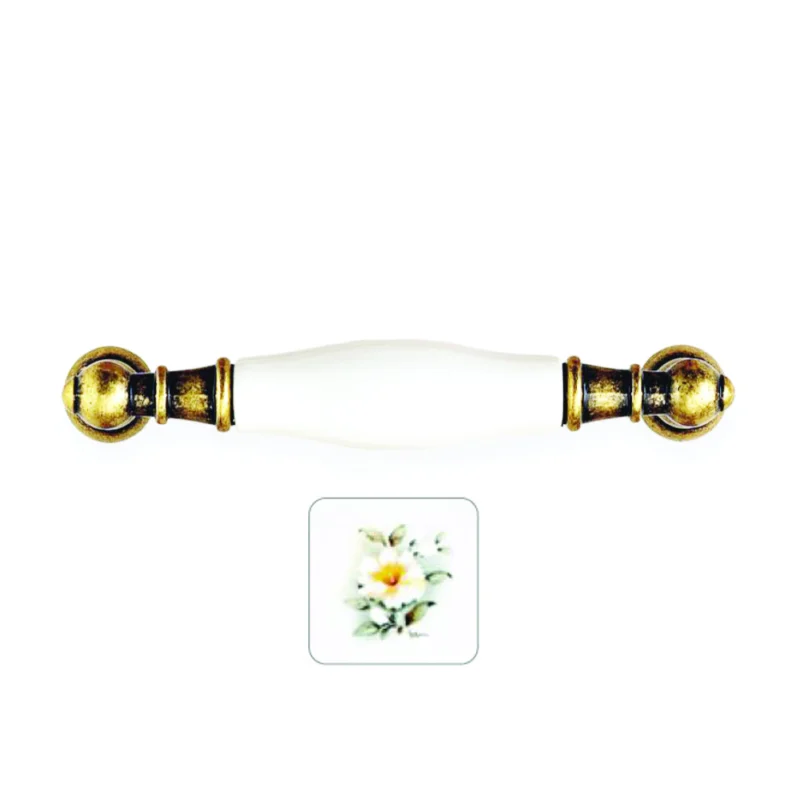 Maniglia elegante in porcellana color avorio con decoro a fiore bianco, ideale per ante e cassetti di cucine, bagni e mobili living. Le dimensioni precise (interasse 96 mm, lunghezza 116 mm, larghezza 17 mm) garantiscono una presa comoda e un design raffinato, perfetto per arredamenti classici e country.