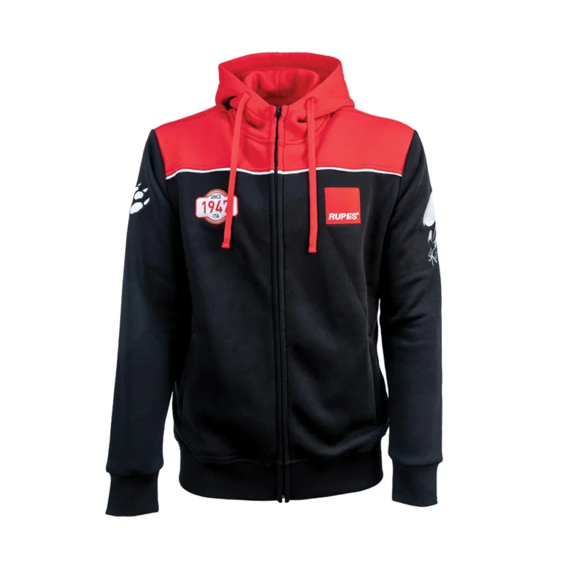 La nuova Felpa RUPES Racing con Cappuccio è caratterizzata dal design e dai colori che hanno reso il merchandising RUPES conosciuto in tutto il mondo. Realizzata per l’80% in cotone pettinato e per il 20% in poliestere, questa felpa con nera e rossa presenta dettagli ricamati sul petto tra cui il logo RUPES e l’anno di fondazione dell’azienda (1947), oltre ai loghi BigFoot e Skorpio su entrambe le maniche.