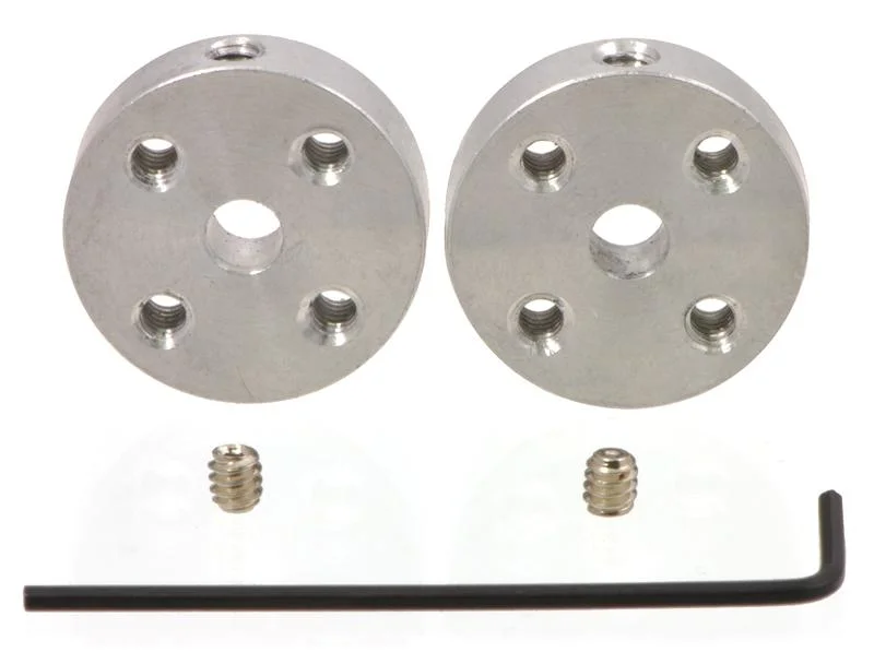Questi mozzi di montaggio universali in alluminio consentono di montare ruote e meccanismi personalizzati su alberi motore di 4 mm di diametro. Il set include due mozzi, due viti di fermo M3 per fissare i mozzi agli alberi del motore e una chiave a brugola da 1,5 mm da utilizzare con le viti di fermo. Ogni mozzo ha quattro fori di montaggio filettati per viti M3 (non incluse).