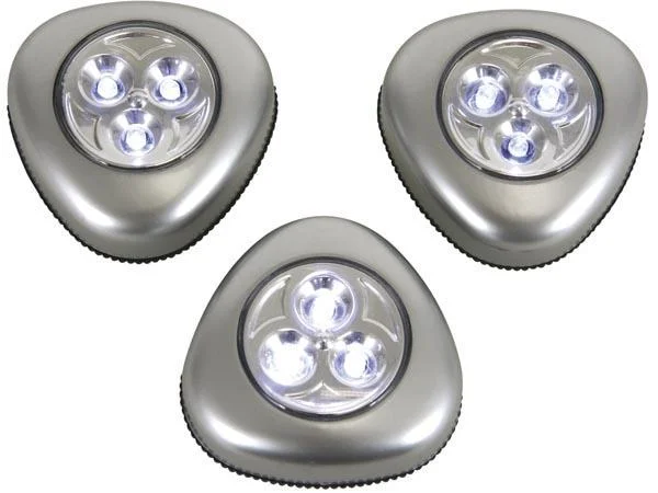 Queste luci a LED autoadesive aderiscono a quasi tutte le superfici grazie al retro adesivo. Con una semplice pressione la lampada si accende o si spegne e le batterie possono essere facilmente sostituite grazie al sistema twist-lock. La lampada \\u00E8 alimentata da 3 batterie AAA (non incluse) per circa 100 ore di funzionamento.Specifiche Colore: argento Alimentazione: 3 batterie AAA da 1,5 V (non incluse) Dimensioni: \\u00D8 70 x 22 mm Peso: 25 g